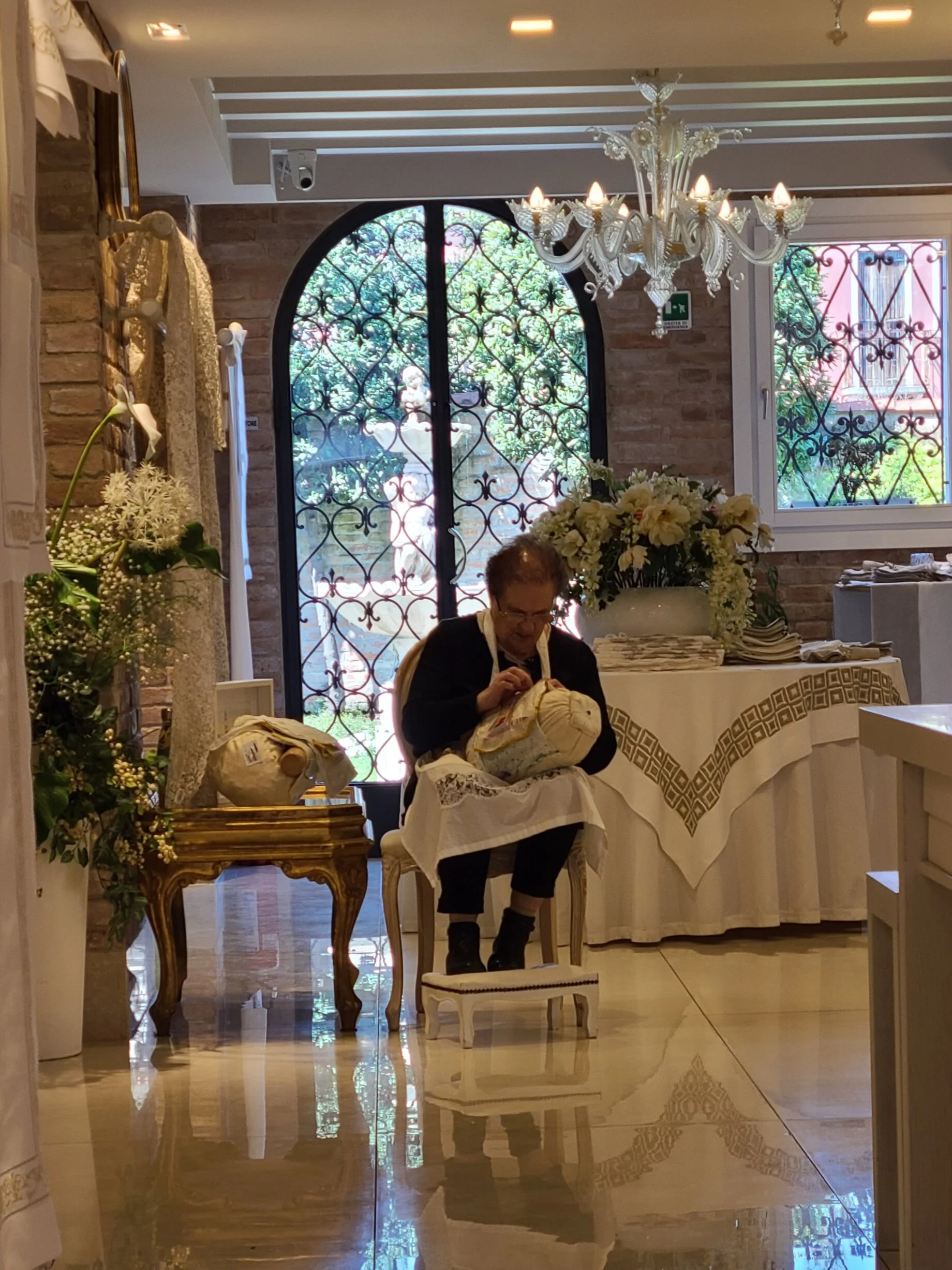 One of the first shops I stopped by had a woman creating lace as they have for centuries. The Venetian lace from Burano became the most highly coveted lace in Europe. I purchased a beautiful, but simple piece of lace for the Blessed Mother statue on my bedroom dresser.